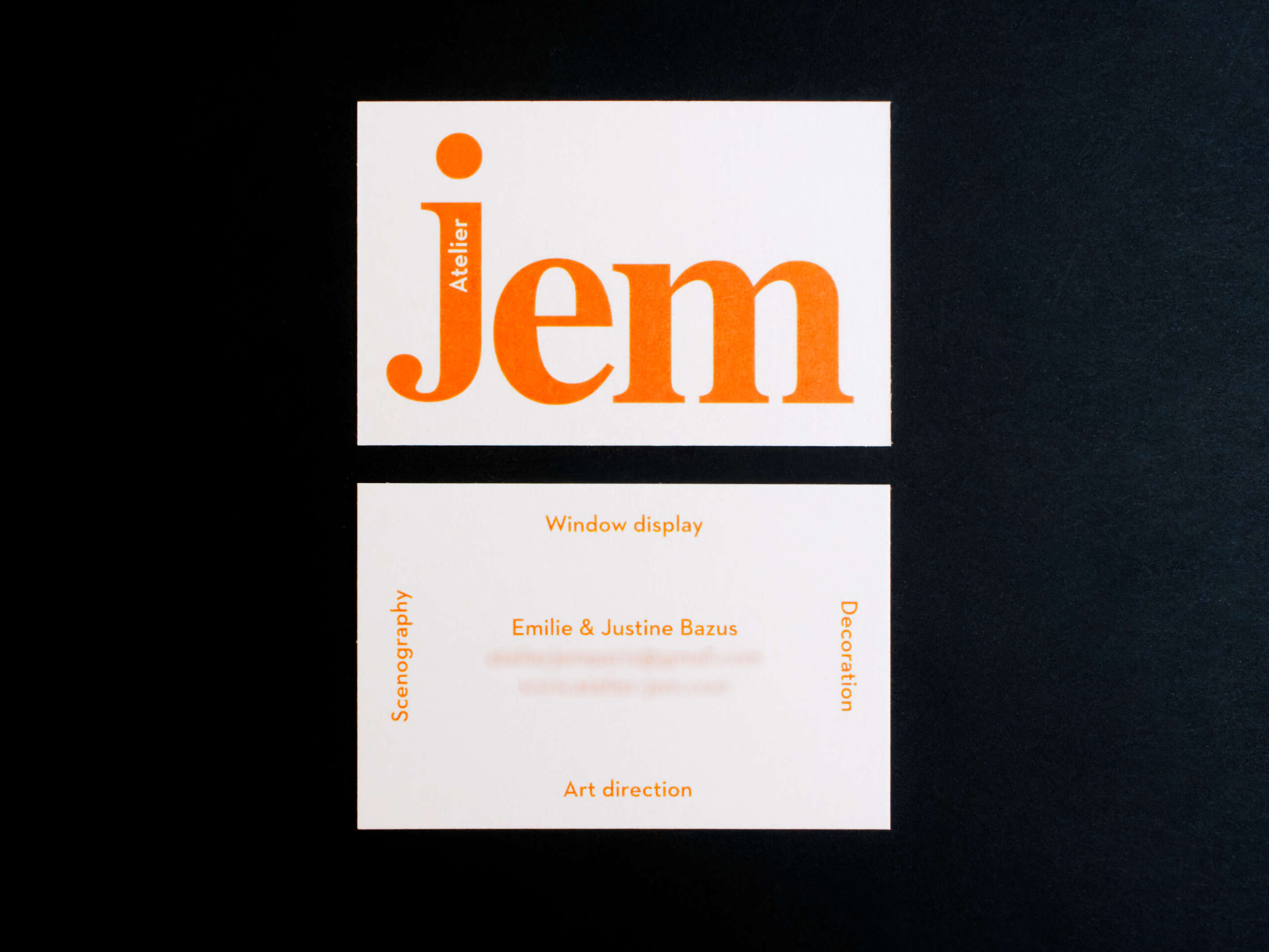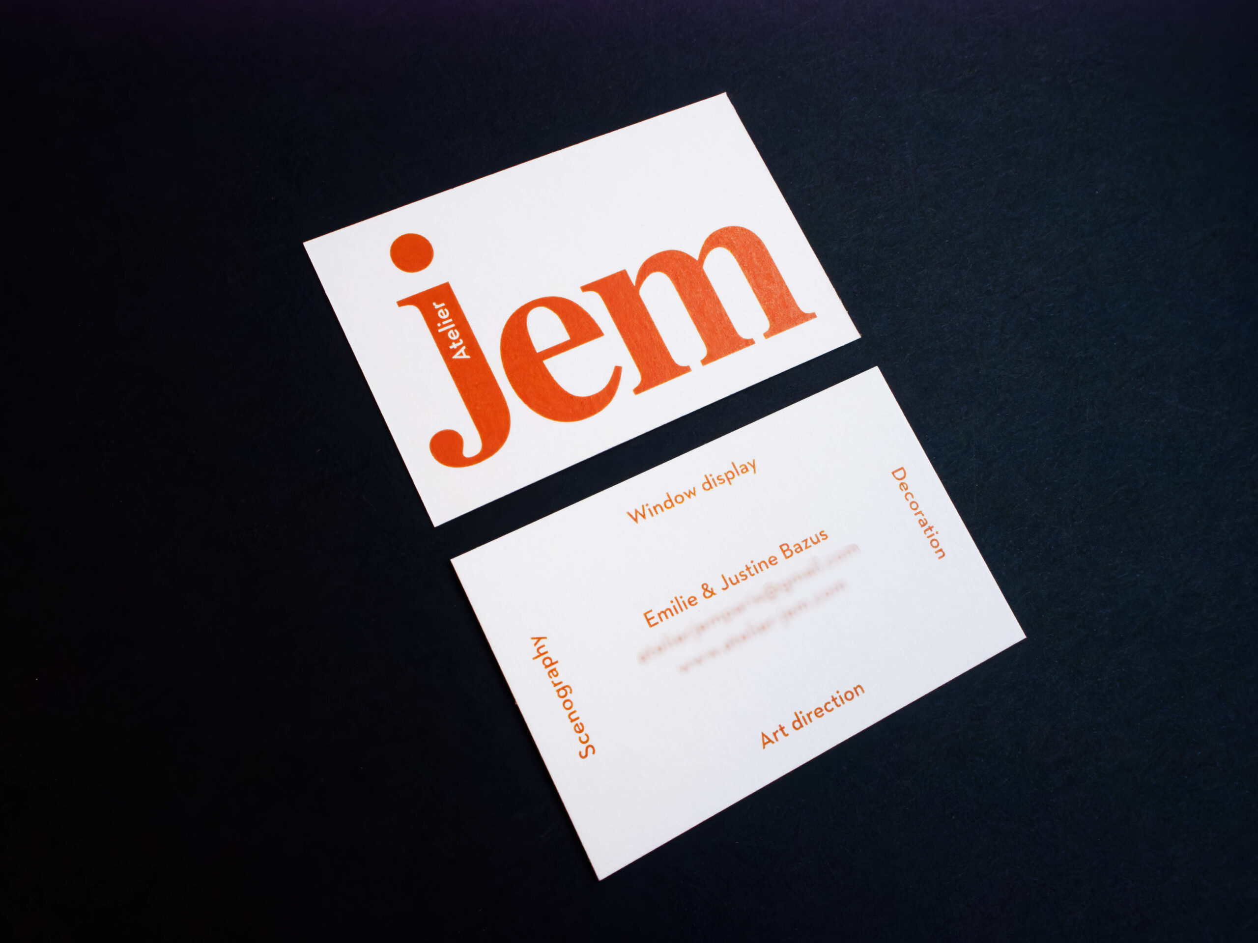 Pour Atelier JEM, nous avons réalisé une carte de visite à l’esthétique résolument graphique et contemporaine. Au recto, la typographie devient manifeste. Le nom atelier jem s’étire sur toute la largeur dans une lettre souple et puissante, occupant l’espace avec assurance. L’usage des minuscules apporte une respiration subtile, laissant les blancs dialoguer avec la masse typographique pour un équilibre parfaitement maîtrisé.