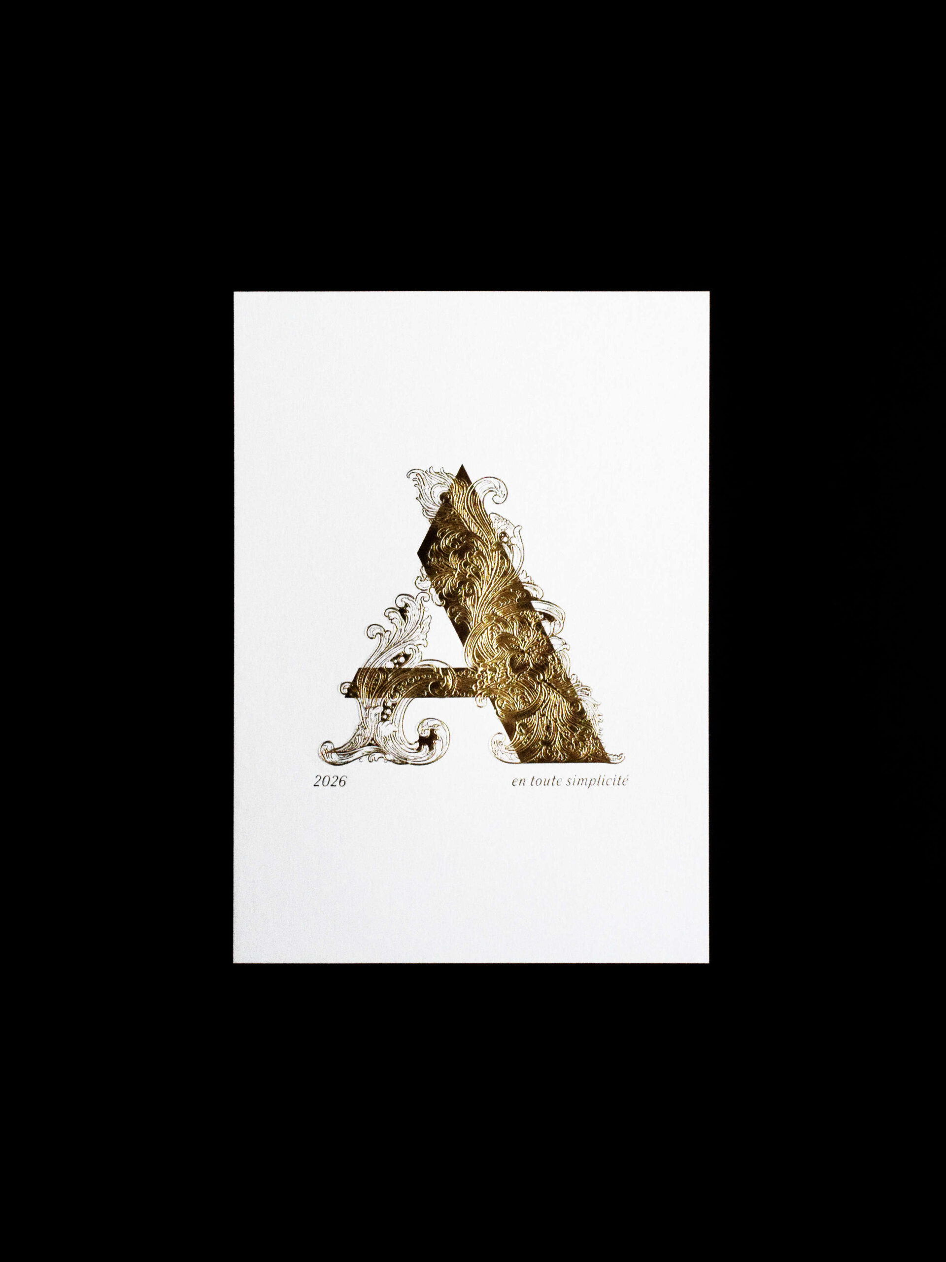 Au cœur de la composition, le A de son logo, à la géométrie affirmée, se complète de délicats ornements floraux. L’ensemble est exécuté en dorure à chaud, créant un contraste élégant entre la structure pleine de la lettre et la légèreté des tracés courbes et floraux.