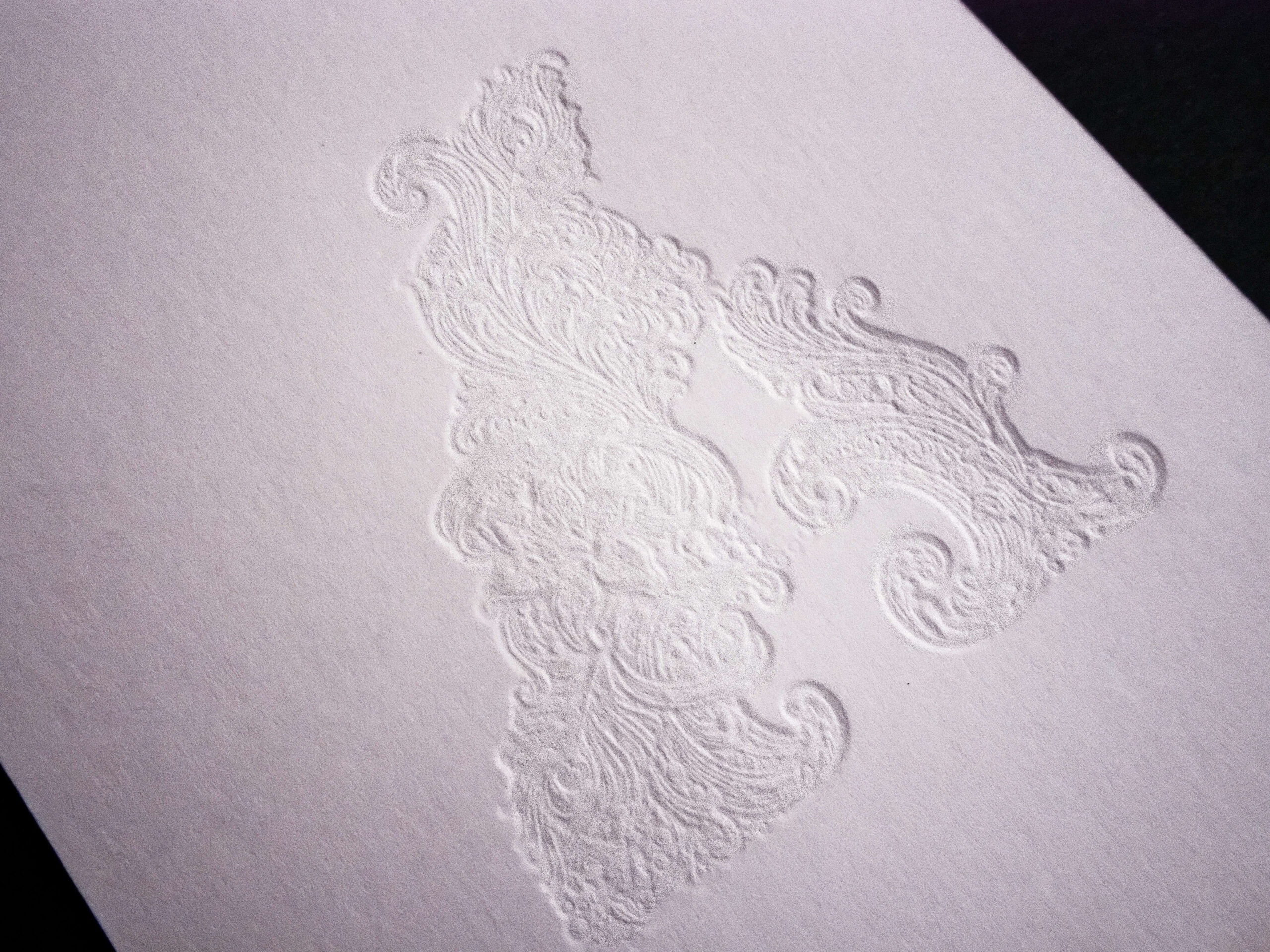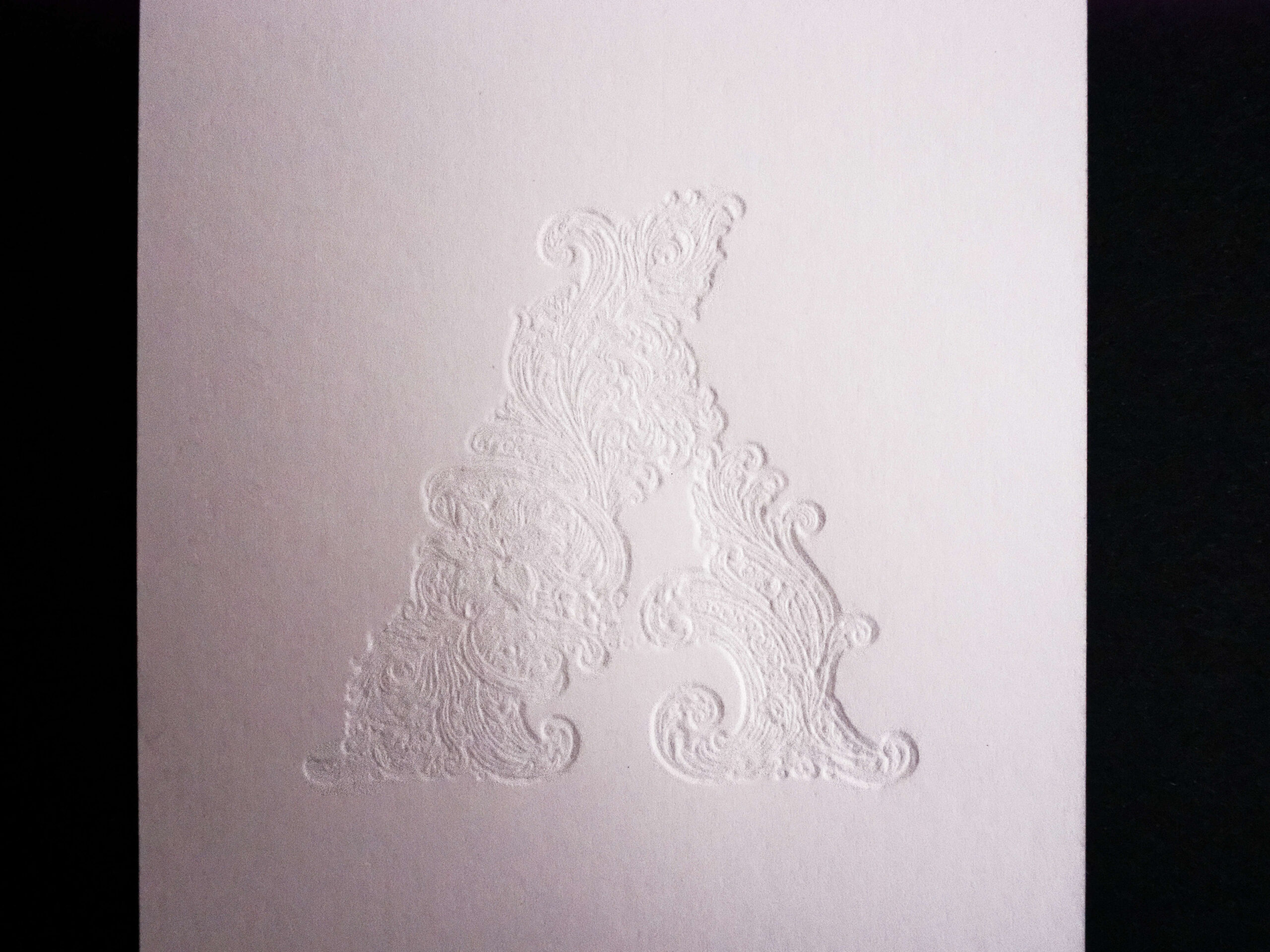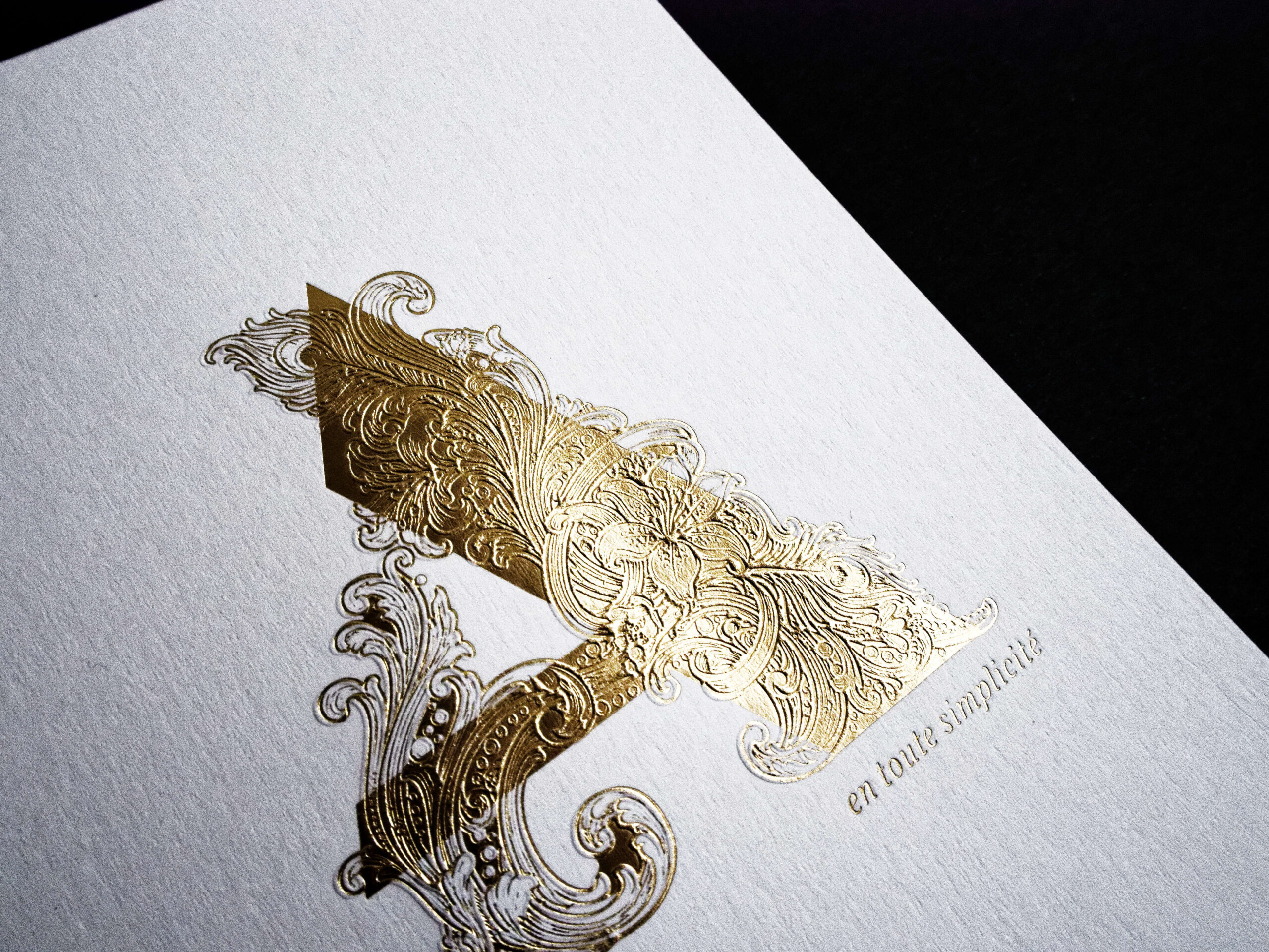 La subtilité de cette carte réside dans un repiquage en gaufrage : après la première impression en dorure, un second passage vient sculpter la matière, grâce à un calage d’une précision extrême. Le motif floral pénètre alors le papier, laissant apparaître au verso une empreinte en défonce, discrète et raffinée.