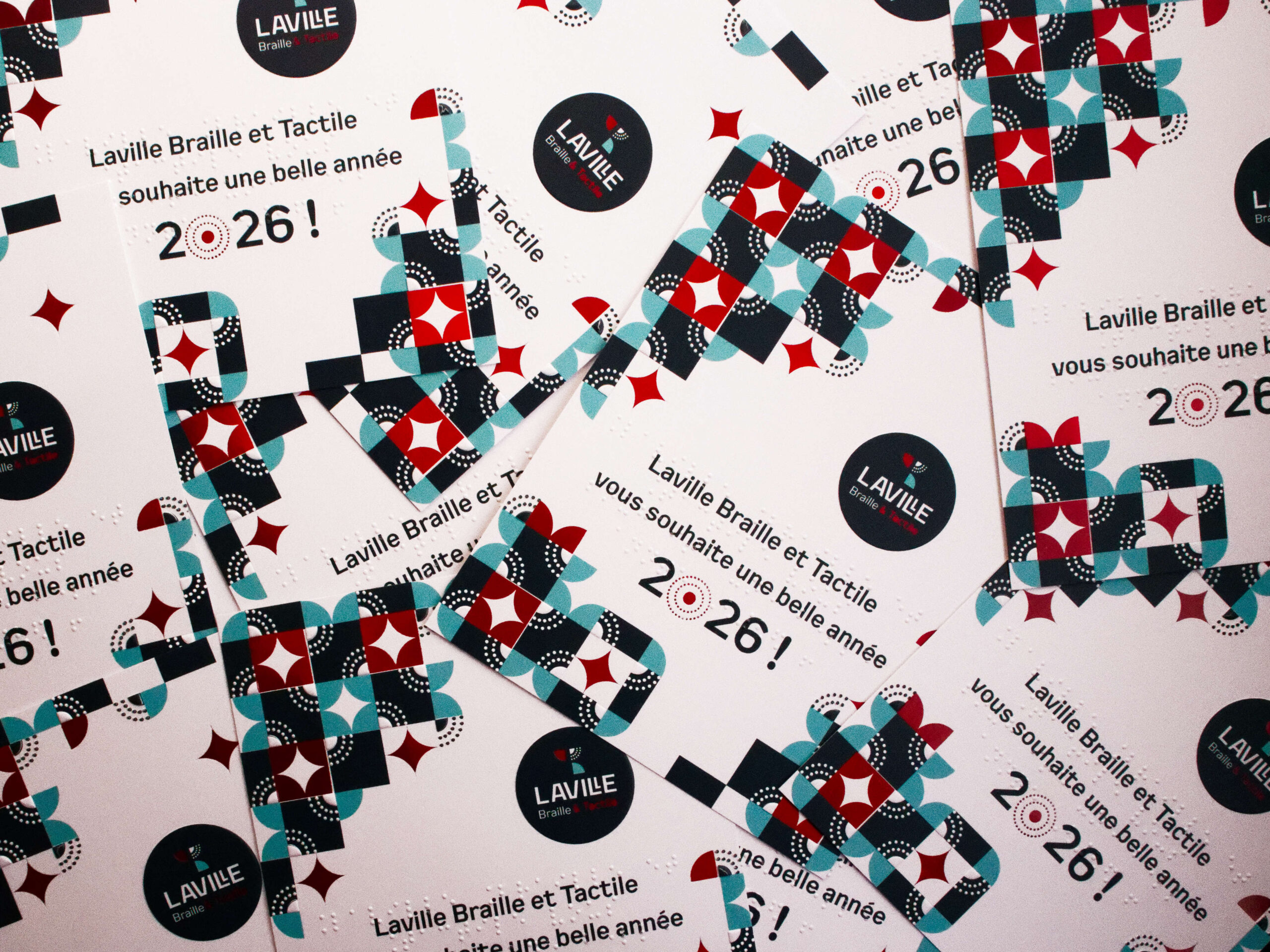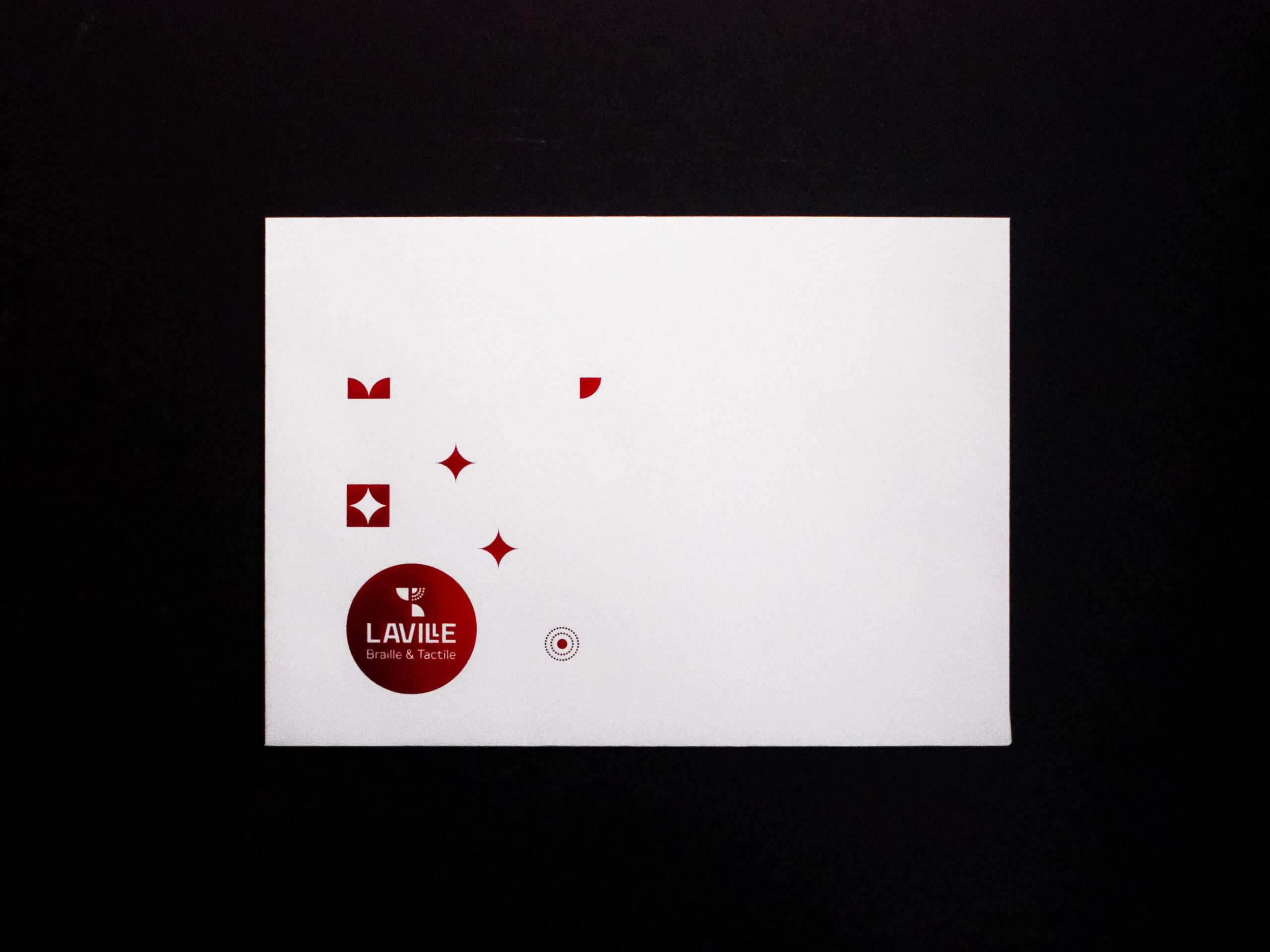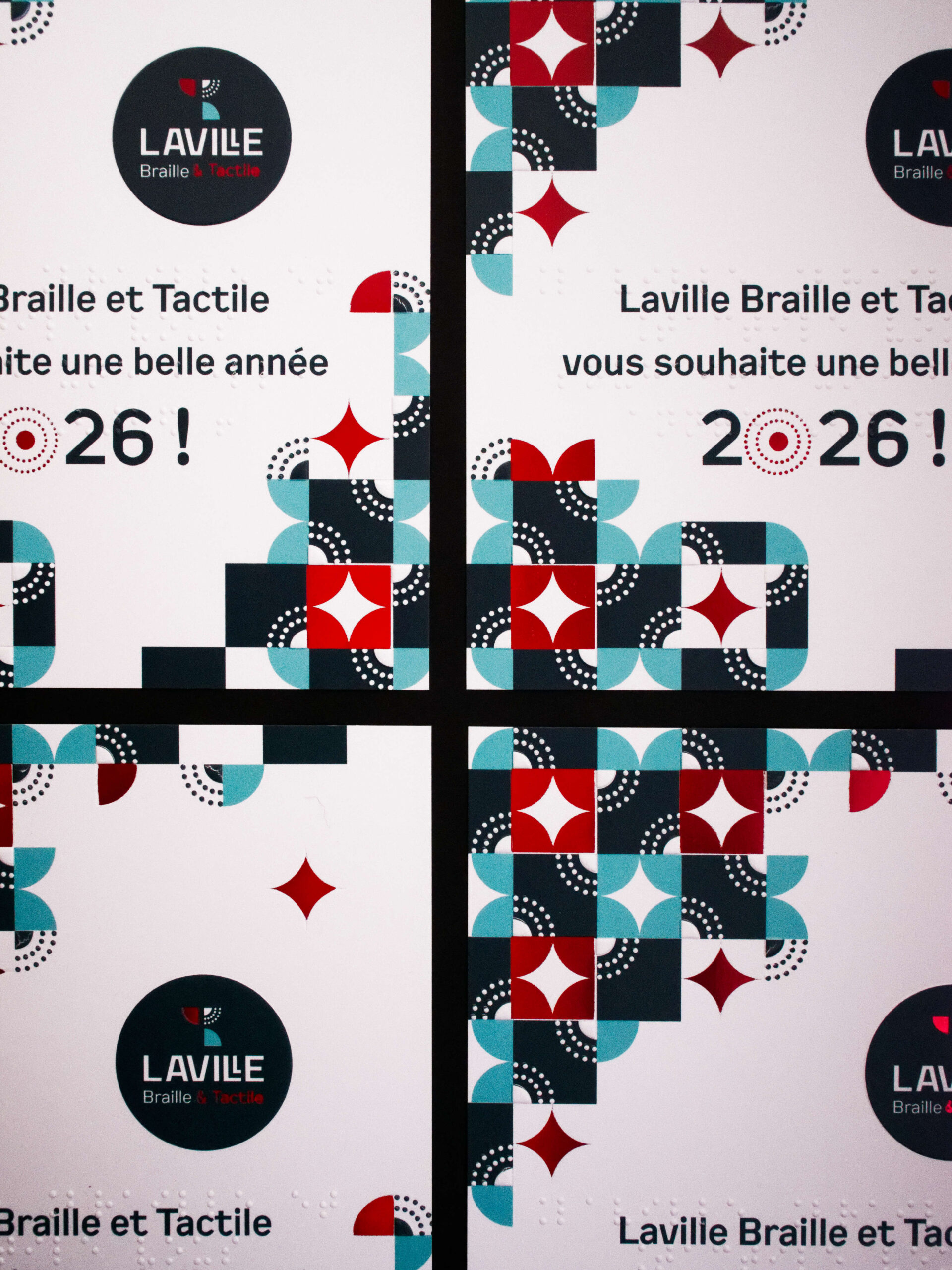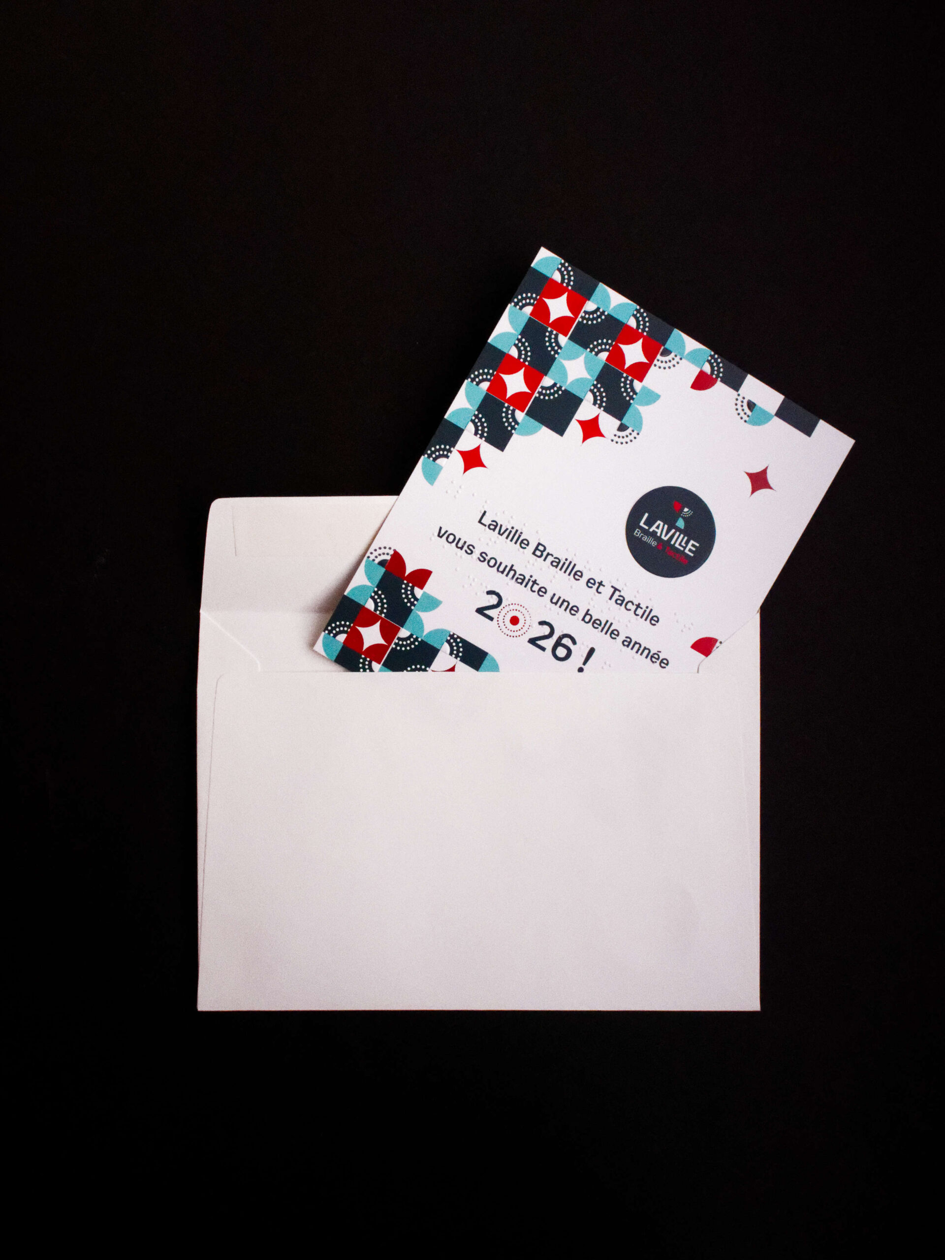 Laville Imprimerie accompagne également Laville Braille & Tactile, son entité dédiée à l’adaptation d’œuvres d’art et de documents pour les publics déficients visuels. À l’occasion du dévoilement de leur nouvelle identité graphique, la création d’un ensemble carte de vœux et enveloppe s’est imposée comme un support idéal pour affirmer leur positionnement et renouveler leur engagement auprès des musées, partenaires et associations.