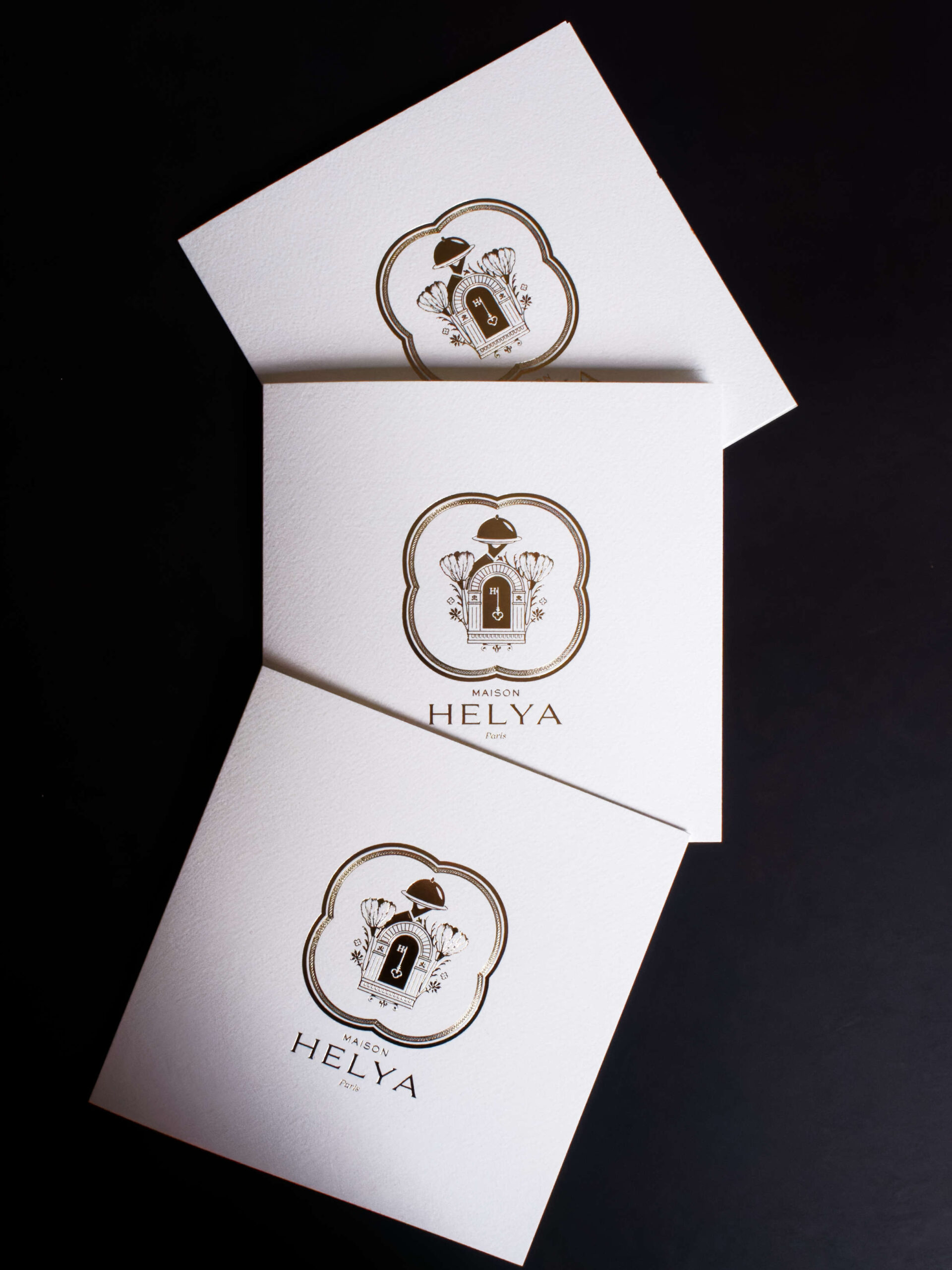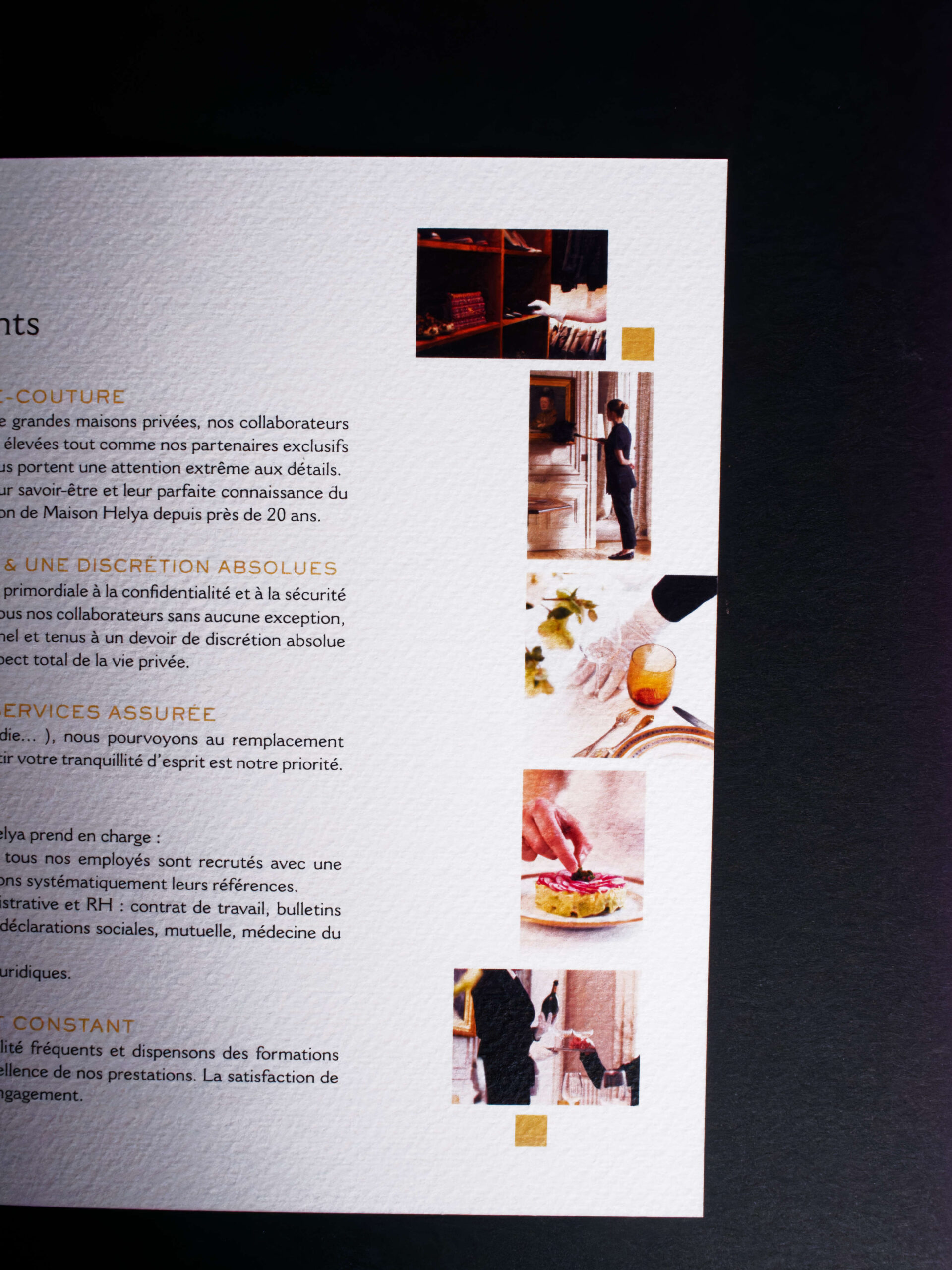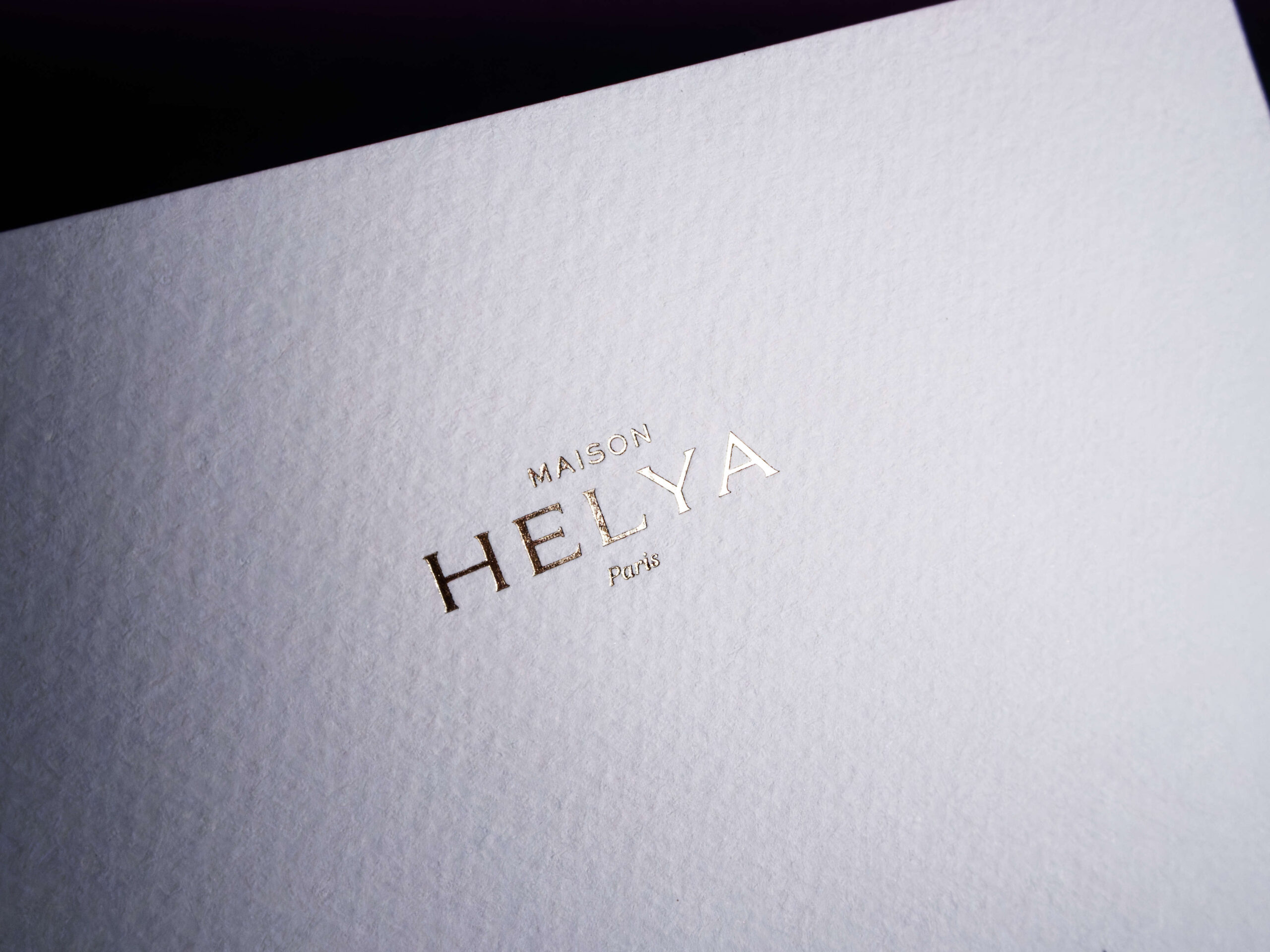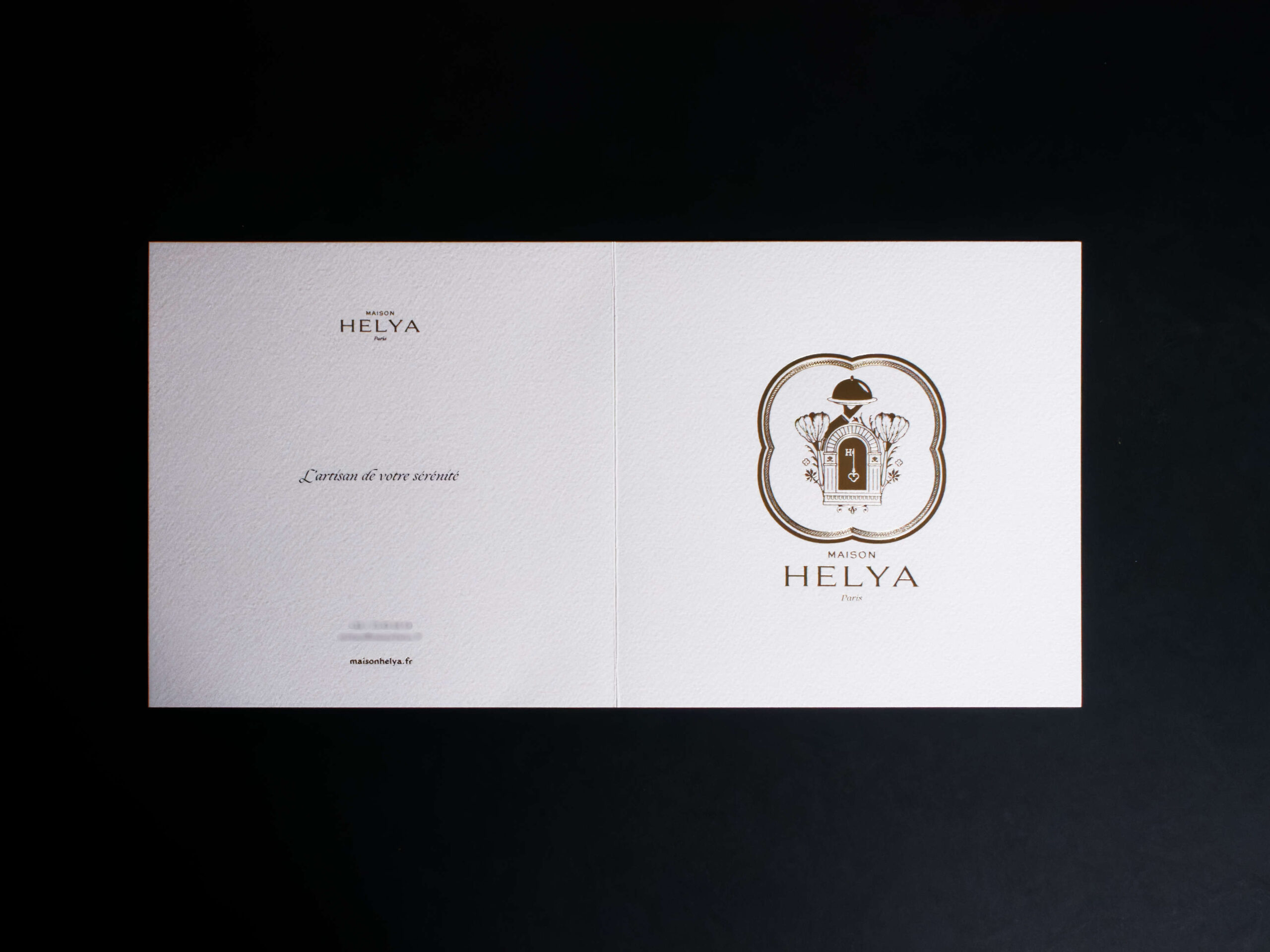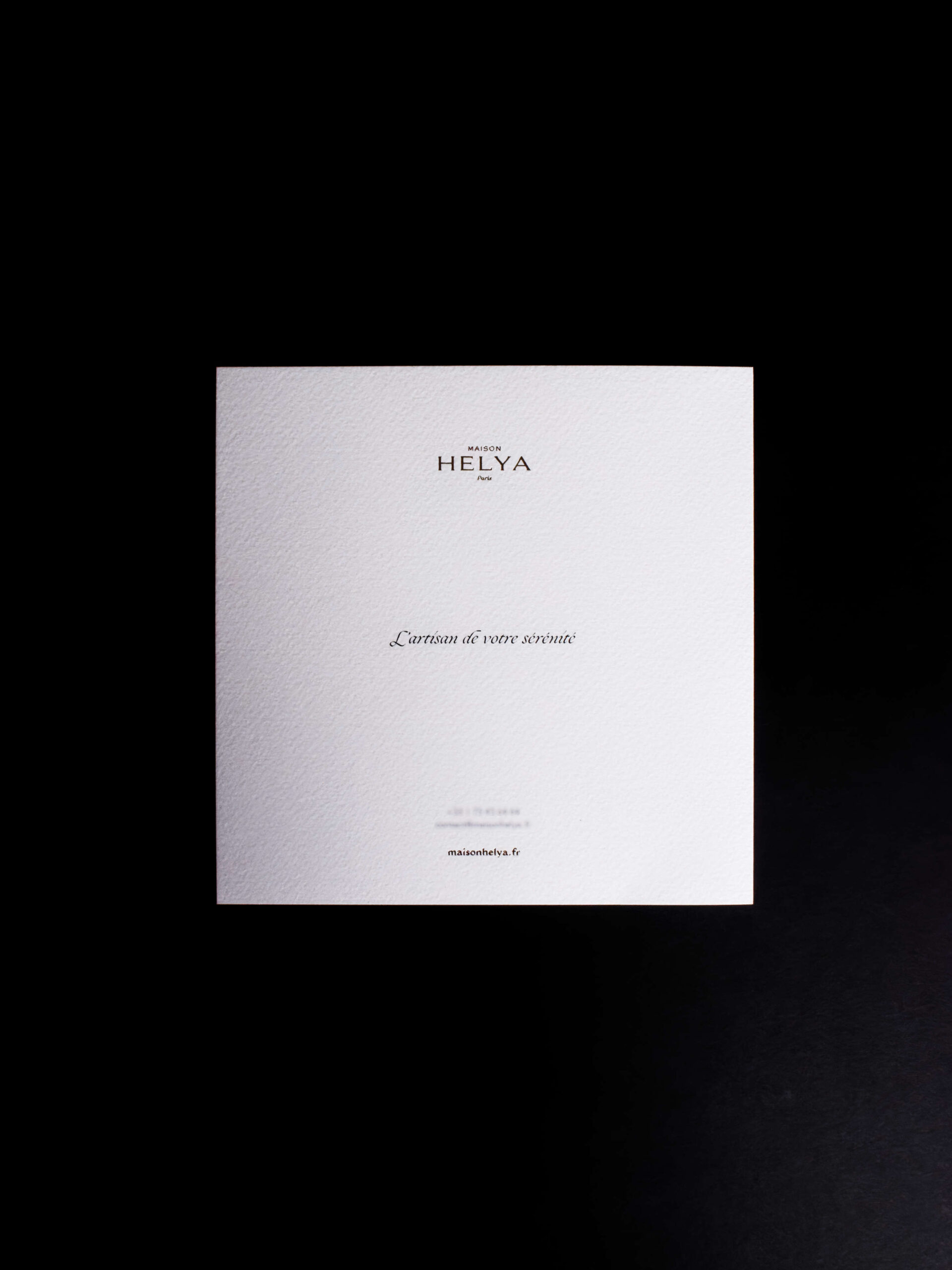 À l’intérieur, une impression en quadrichromie met en valeur l’étendue des services proposés par la Maison Helya. L’ensemble se conclut au dos par un choix sobre et maîtrisé : le logo en marquage à chaud accompagné des coordonnées de la maison.