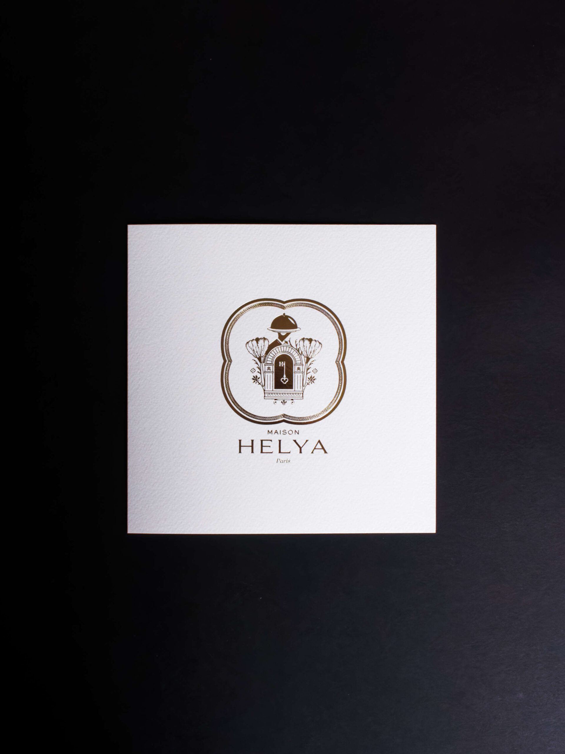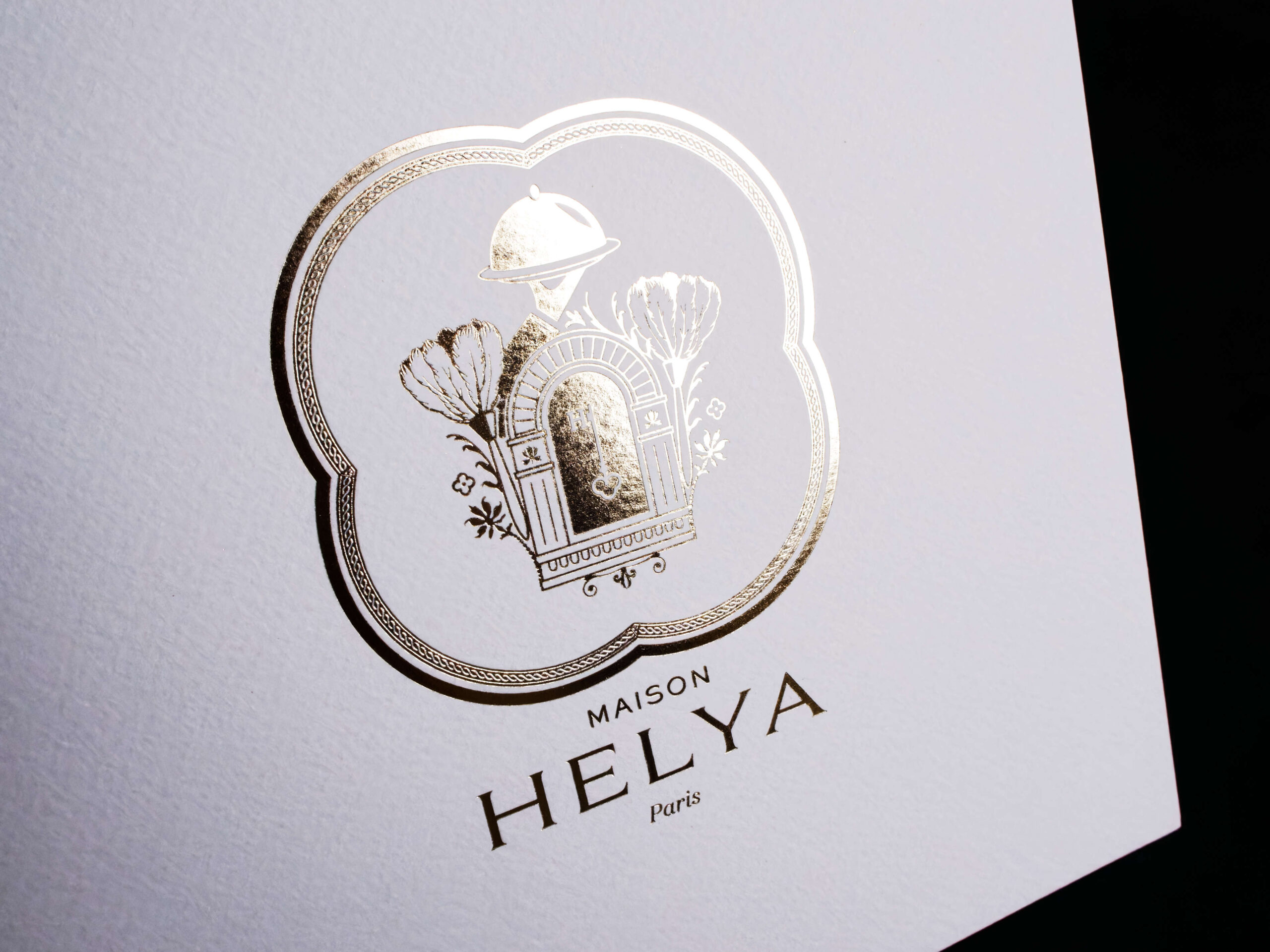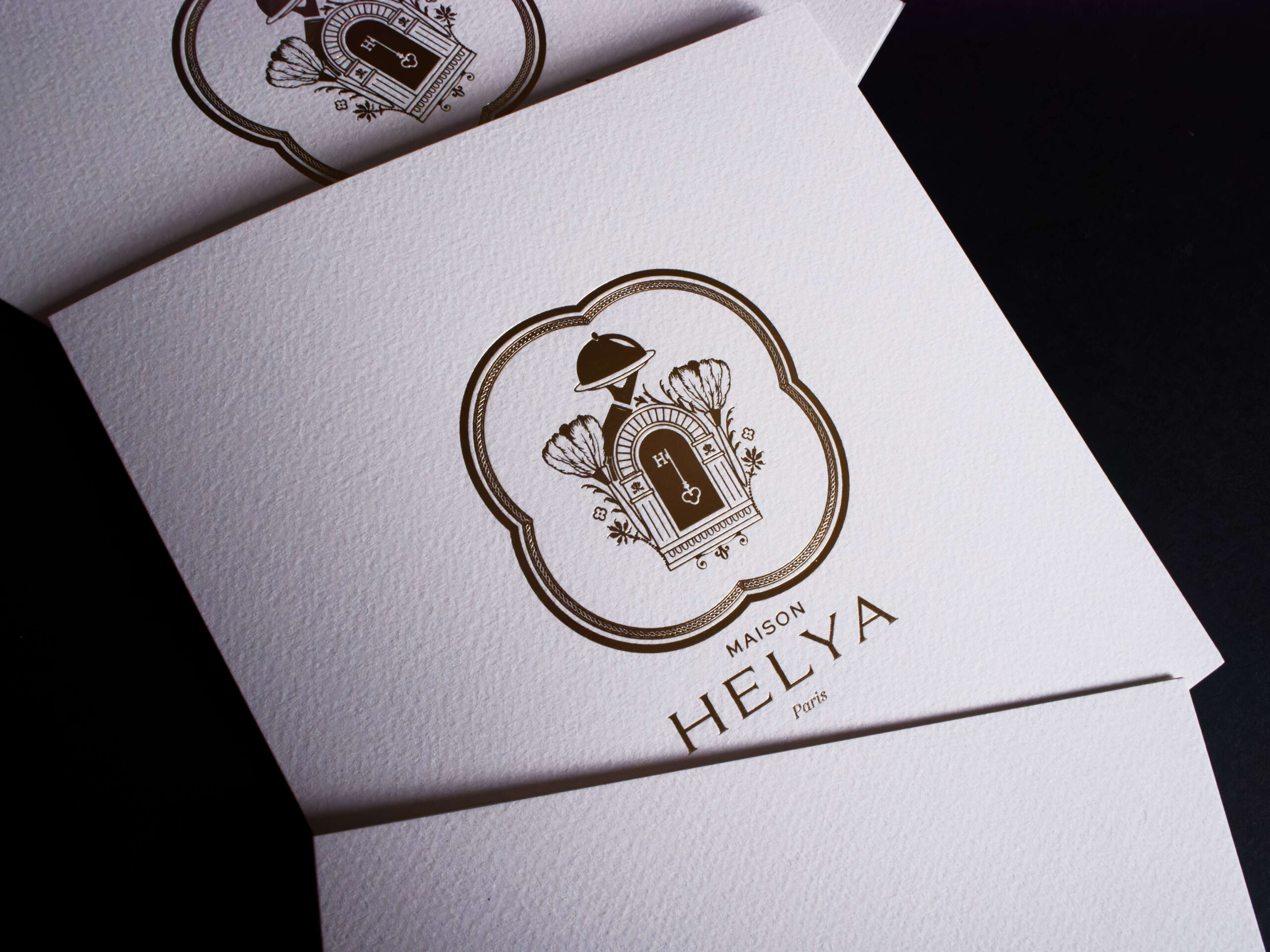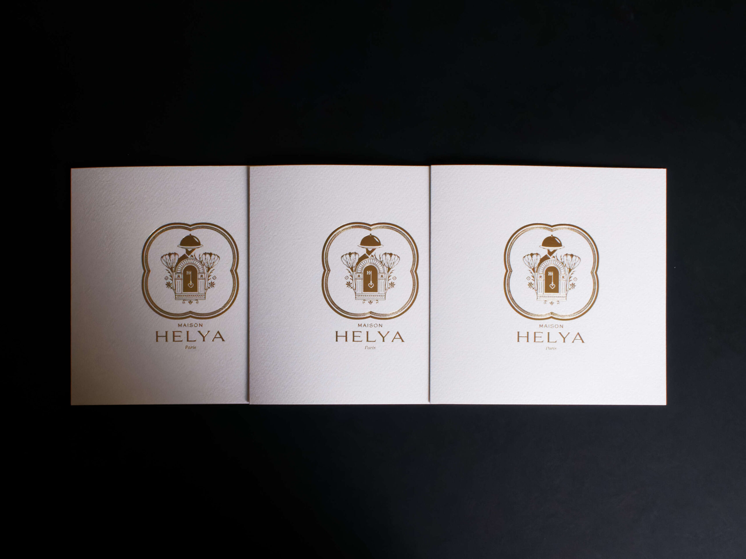 À l’intérieur, une impression en quadrichromie met en valeur l’étendue des services proposés par la Maison Helya. L’ensemble se conclut au dos par un choix sobre et maîtrisé : le logo en marquage à chaud accompagné des coordonnées de la maison.