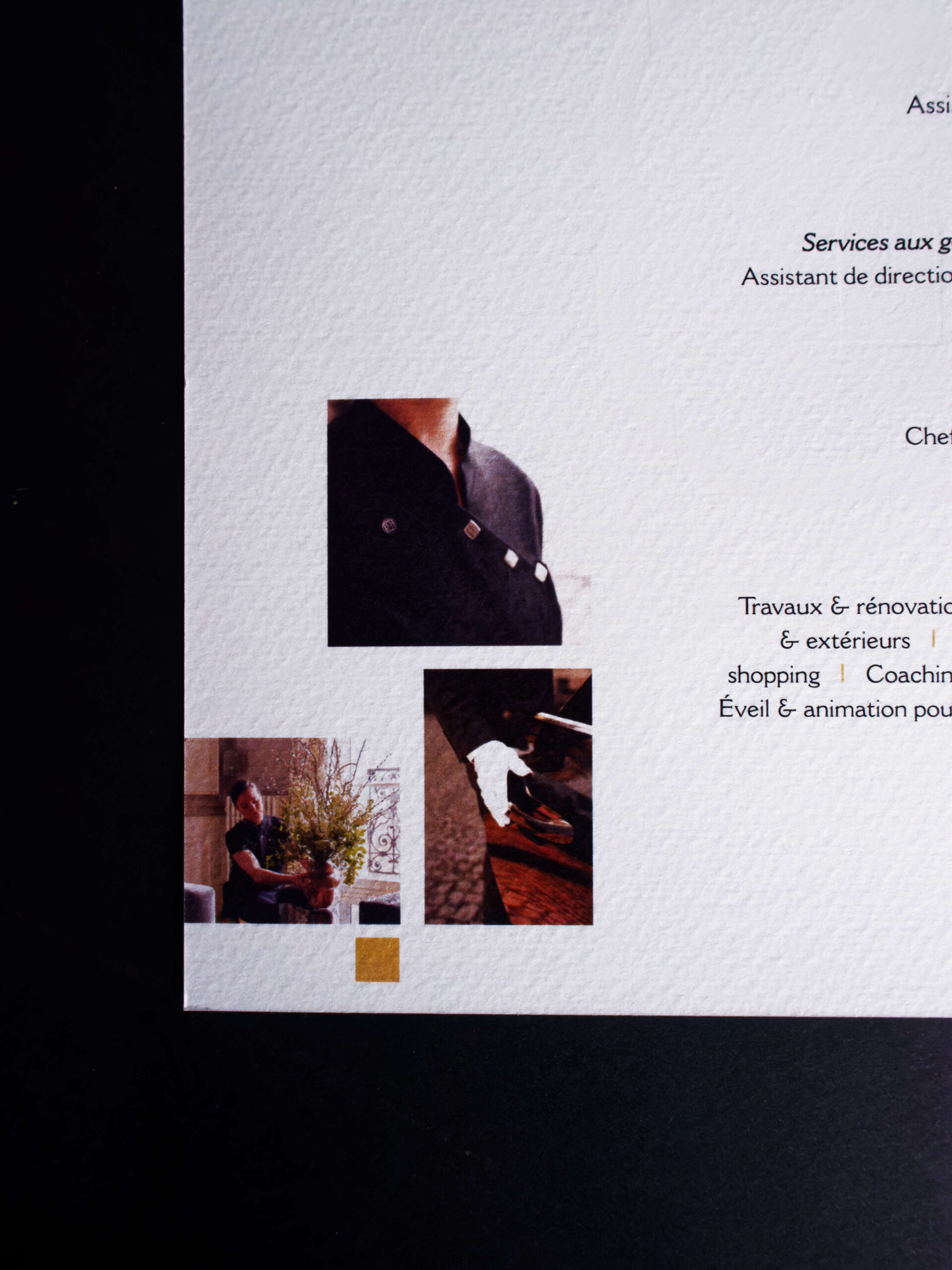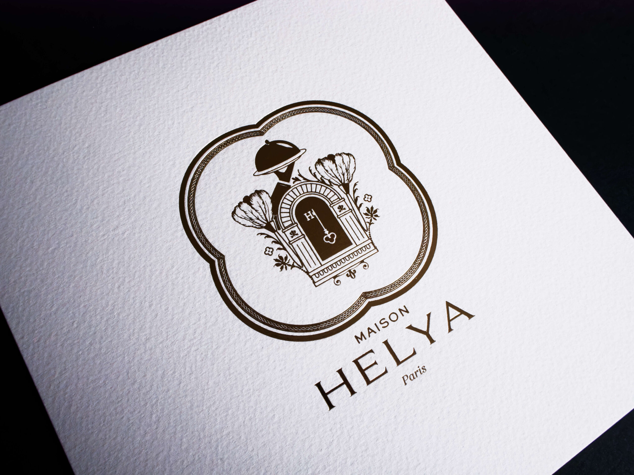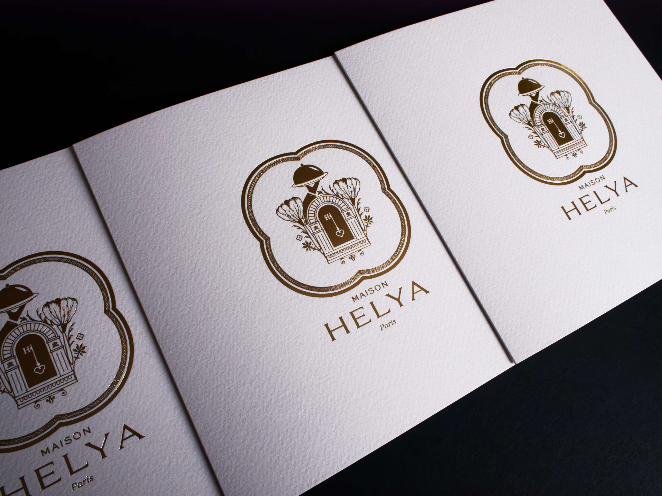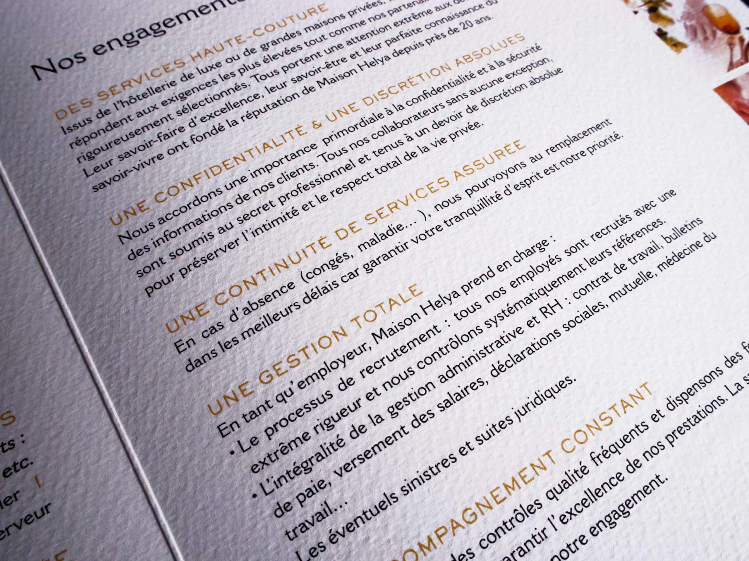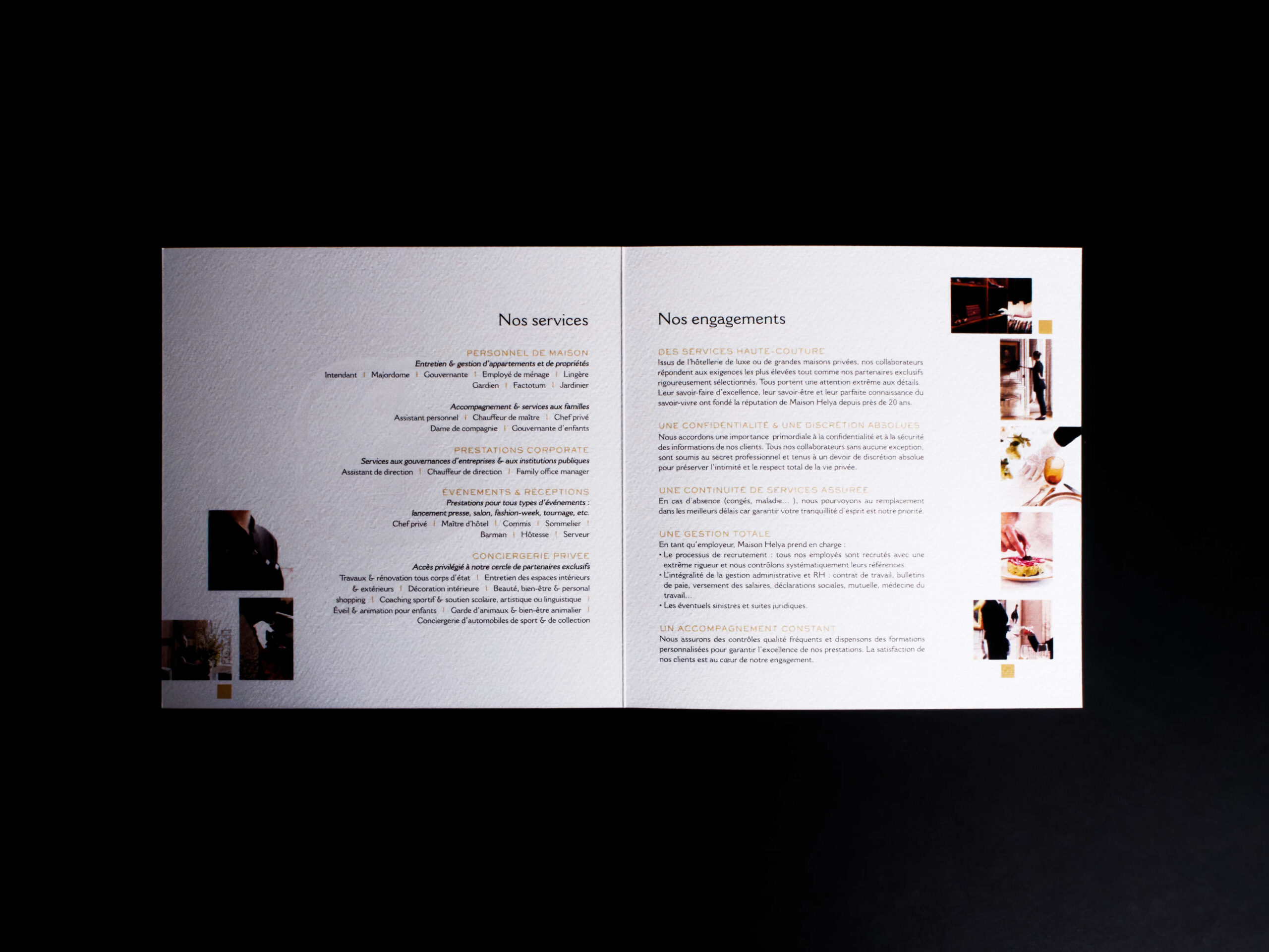 À l’intérieur, une impression en quadrichromie met en valeur l’étendue des services proposés par la Maison Helya. L’ensemble se conclut au dos par un choix sobre et maîtrisé : le logo en marquage à chaud accompagné des coordonnées de la maison.